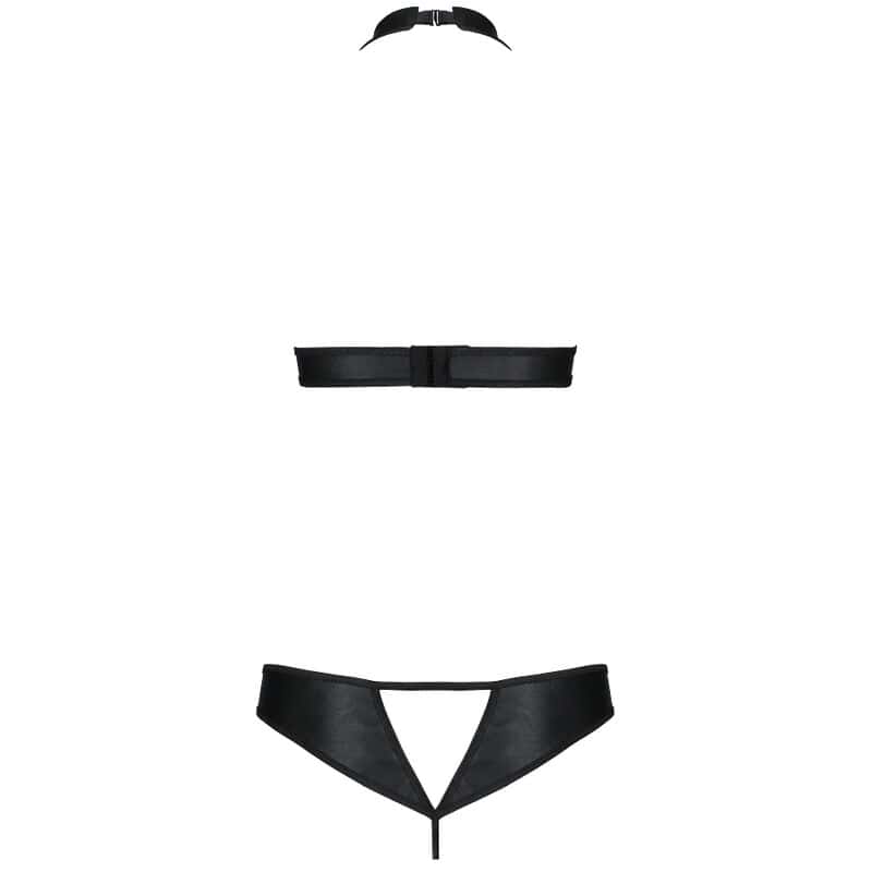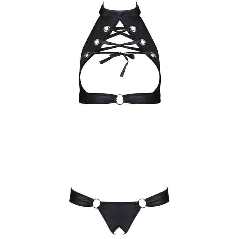 Malwia est un ensemble composé dun haut en cuir fixé au cou par des anneaux et des lacets décoratifs, qui souligne et sublime le buste et le string avec une charmante découpe. Les joints décoratifs en forme de cercles confèrent un charme particulier.