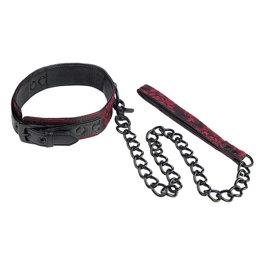 Prenez le contrôle ou abandonnez-vous avec le collier Scandal avec laisse, conçu pour une domination élégante et une soumission palpitante. Ce collier double face offre un confort moelleux à lintérieur et un séduisant brocart rouge et noir à lextérieur. La laisse en chaîne métallique amovible invite à des interactions ludiques et créatives avec dautres équipements.