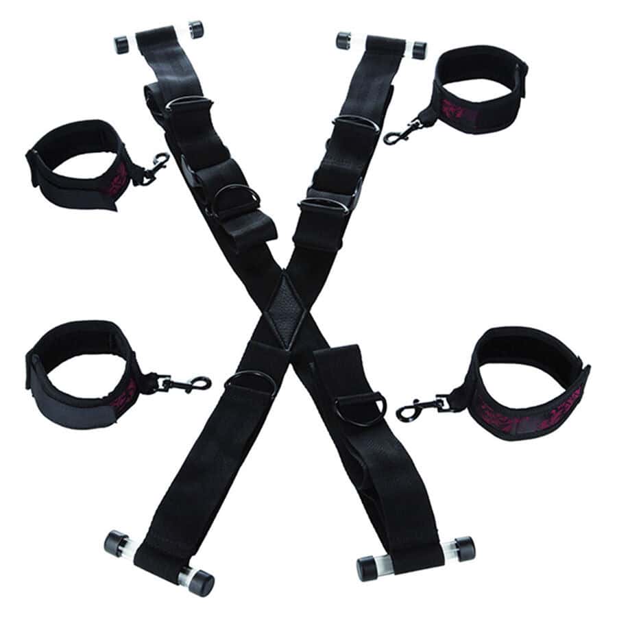 Donnez une nouvelle dimension au bondage avec la croix Scandal® Over the Door. Ce système de contrainte en croix sinstalle rapidement : placez les crochets robustes sur nimporte quelle porte, attachez les poignets et les chevilles de votre partenaire avec les menottes rouges et noires moelleuses et laissez-vous surprendre par son corps vulnérable et exposé. Les fermetures Velcro réglables assurent un ajustement parfait et confortable, tandis que les fermoirs universels permettent un repositionnement rapide pour des jeux sans interruption.