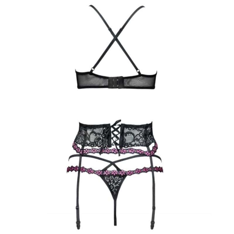 Un ensemble de lingerie exclusif et élégant en dentelle noire complexe. Un soutien-gorge coquet à fines bretelles croisées dans le dos, orné de bretelles et de bijoux argentés. Elégant porte-jarretelles noué dans le dos par un ruban de satin. Une décoration supplémentaire est constituée de deux rubans de fleurs roses. Lensemble comprend un string tentant avec un petit cœur argenté.