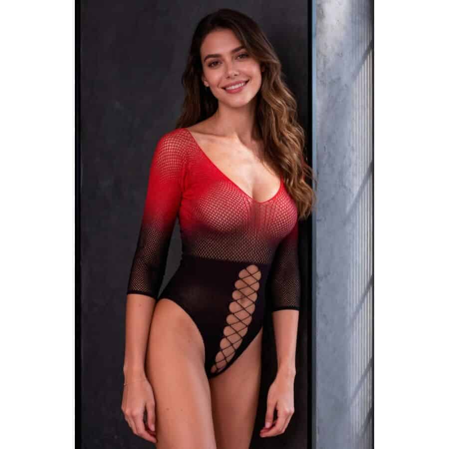 PASSION – BS118 BODYSTOCKING EN MAILLE NOIRE ET ROUGE