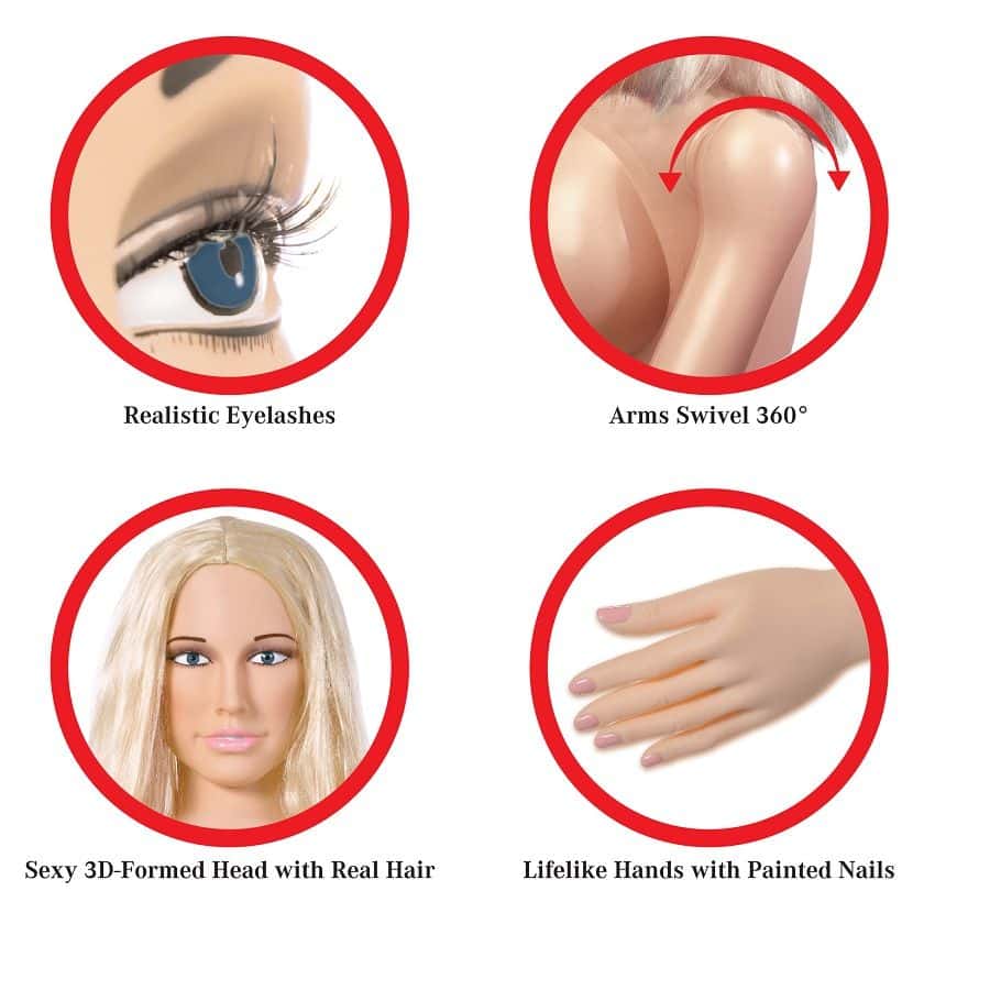 Cette incroyable poupée damour gonflable grandeur nature a été méticuleusement conçue avec des caractéristiques réalistes pour une expérience vraiment réaliste. Sa tête sexy en 3D présente des cils réalistes et une luxueuse tête de vrais cheveux qui ne demandent quà être tirés! Regardez-la vraiment prendre vie avec des bras qui pivotent à 360 degrés et des doigts et des ongles délicieusement peints. Serrez ses seins fermes et gaies pendant que vous appréciez sa peau, sa chatte et son cul Fanta-Flesh ? ultra-réalistes qui se sentent encore mieux que la vraie chose! La chatte et le cul Fanta-Flesh ? sont amovibles pour un nettoyage en profondeur facile et peuvent même être appréciés séparément pour la masturbation. Une pompe de gonflage, un kit de réparation de vinyle et des instructions sont inclus.