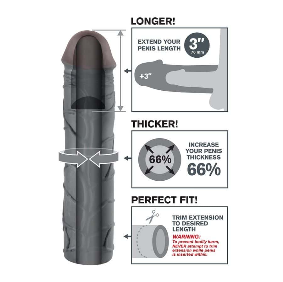 Lextension Mega 3? est une extension personnalisable qui peut être facilement coupée à la base pour un ajustement parfait. Il est super extensible pour sadapter à la plupart des tailles et suffisamment ajusté pour vous aider à durer plus longtemps. Votre partenaire bénéficiera dune pénétration plus profonde grâce à lextension de 3? à la pointe, tandis que la tige ultra réaliste vous rend 66 % plus épais tout autour. Le matériau doux Fanta Flesh ressemble à une seconde peau, vous donnant la longueur, la circonférence et la confiance dont vous avez besoin pour satisfaire votre amoureux.